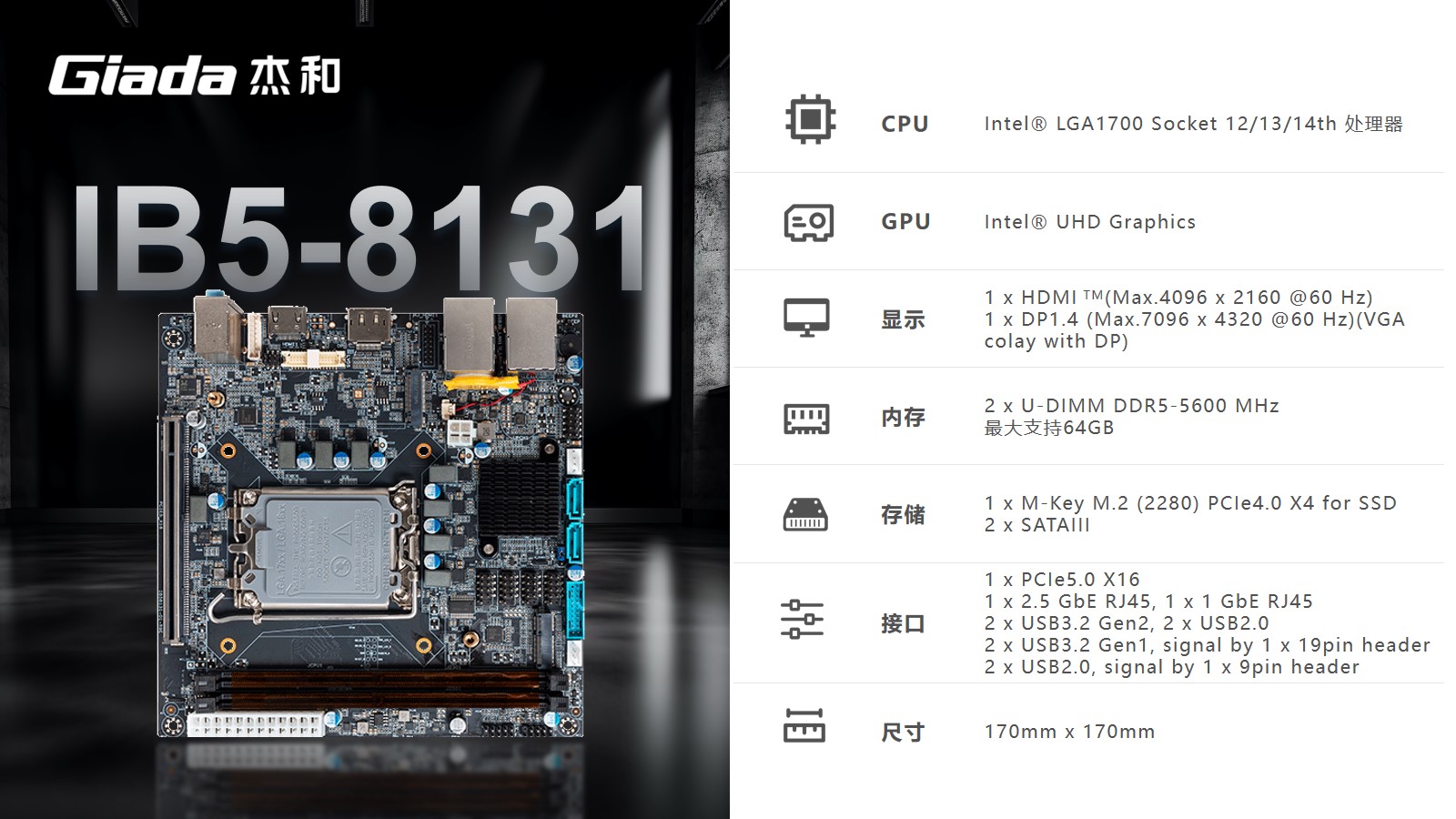 南宫NG·28(中国)相信品牌力量Mini-ITX主板IB5-8131采用Intel® B760芯片组,支持Intel® LGA1700 Socket第12/13/14代CPU。支持1 x HDMI (Max.4096 x 2160 @60 Hz);1 x DP1.4 (Max.7096 x 4320 @60 Hz)(保留 VGA位置)。