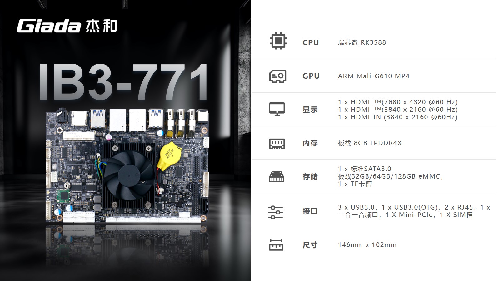 南宫NG·28(中国)相信品牌力量工业级ARM主板IB3-771采用瑞芯微RK3588处理器,内置G610 MP4 GPU,拥有6 TOPS算力的NPU,支持8K视频硬件解码编码及多摄像头输入,支持eDP/DP/ HDMI2.1/MIPI 多种显示接口。