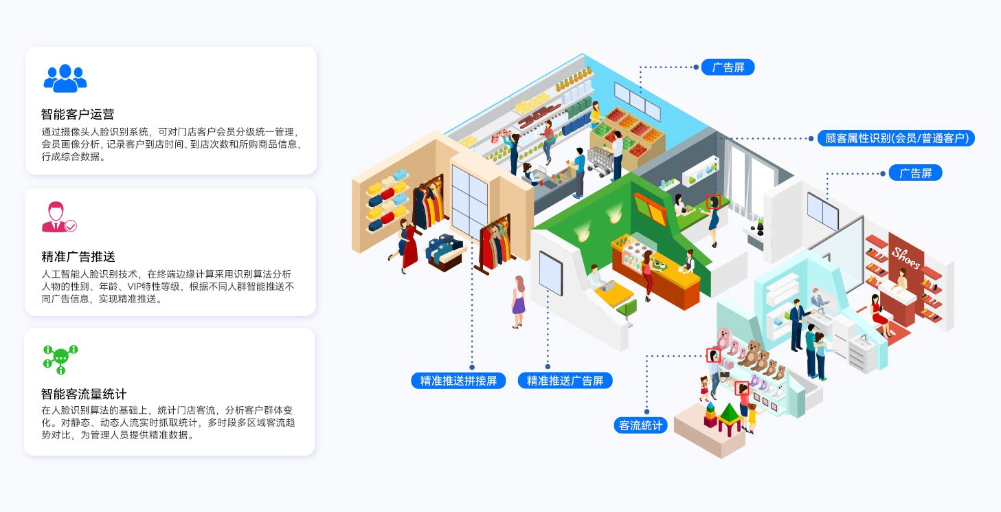 南宫NG·28(中国)相信品牌力量智慧零售解决方案通过南宫NG·28(中国)相信品牌力量GAM-AI视觉识别管理系统,实现推广内容的精准推送,高效触达,系统融合人工智能技术,采用专业的人脸识别算法,通过终端接入摄像设备与AIOT设备,自动识别不同的物体、动作和行为,形成人物画像,提供客流统计和客群分析功能,为零售客户提供精准的门店数字化运营管理方案。