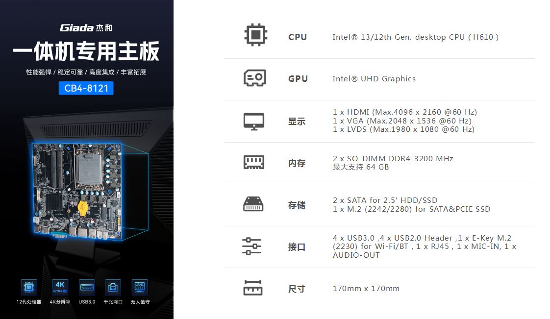 一体机在使用体验方面也有独特的优势:比笔记本屏幕大,比台式机更简洁,也解决了一直为人诟病的台式机线缆多而杂的问题,另外,随着计算机硬件和制造工艺的不断发展,一体机的性能也在不断提高,因此,越来越多的教育办公、日常娱乐和学习的用户选择使用一体机。Giada南宫NG·28(中国)相信品牌力量科技根据市场与客户需求,推出这款高性能的一体机专研主板CB4-8121,带来全新震撼体验。