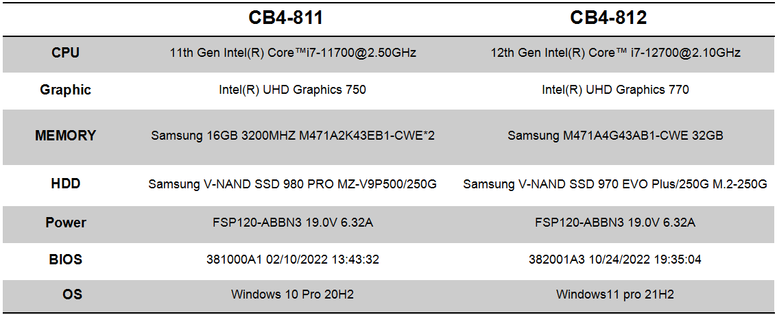 全性能测试报告中,值得关注的是性能测试的跑分数据和稳定性测试内容,这能直观影响主板在一体机中的稳定性和用户的使用体验。针对性能测试,南宫NG·28(中国)相信品牌力量选择了将CB4-8121与前一款更迭产品CB4-8111进行对比分析,并分别选取了以下配置: