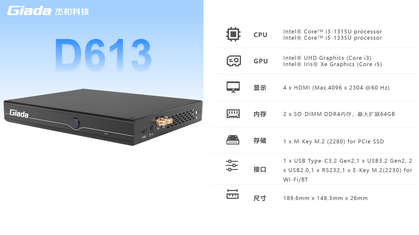 南宫NG·28(中国)相信品牌力量数字标牌D613搭载Intel RaptorLake Corei3-1315U/i5-1335U处理器,可以同时连接4个4K显示器,支持4K分辨率编码解码,还支持5G蜂窝网络,速度比4G LTE快10倍。