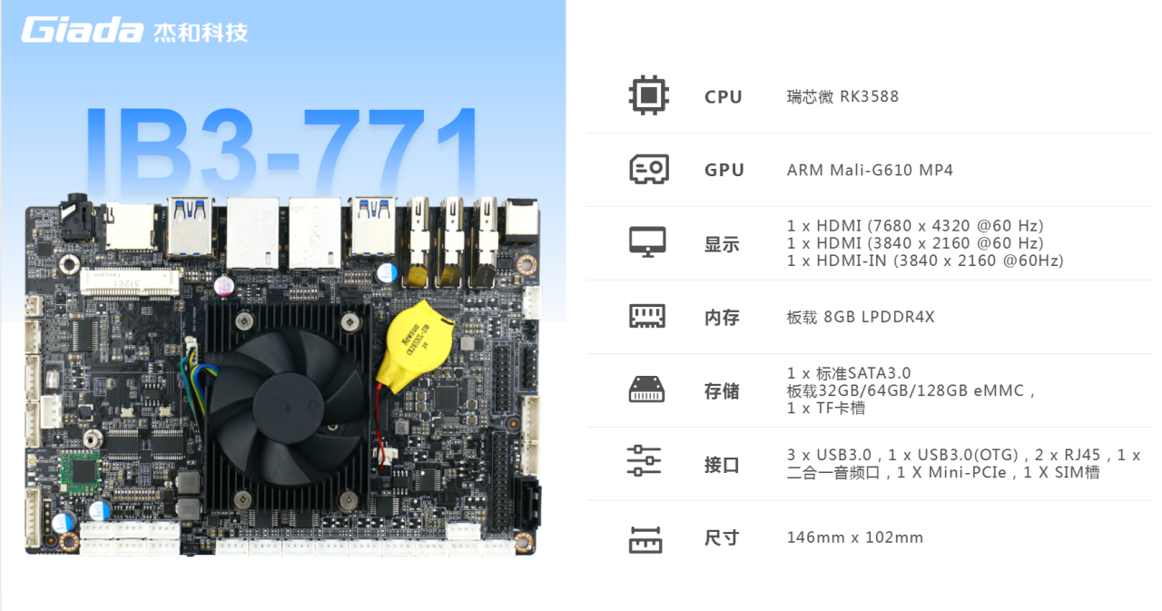 南宫NG·28(中国)相信品牌力量主板IB3-771搭载瑞芯微RK3588八核64位处理器,内置6TOPS算力的NPU,具备高算力、内存大、超强多媒体、多重扩展等技术优势。满足8k超高清视频的显示需求,还支持主流深度学习框架,为各类 AIOT 应用场景提供更优的性能表现,支持机器人、边缘计算、智能NVR、智能汽车、智慧大屏、AR/VR、智能自助终端场景的广泛应用。